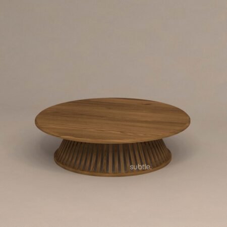 The cir- cular tabletop invites gatherings, ensuring conversations flow effortlessly displaying contemporary touch on classic design.
